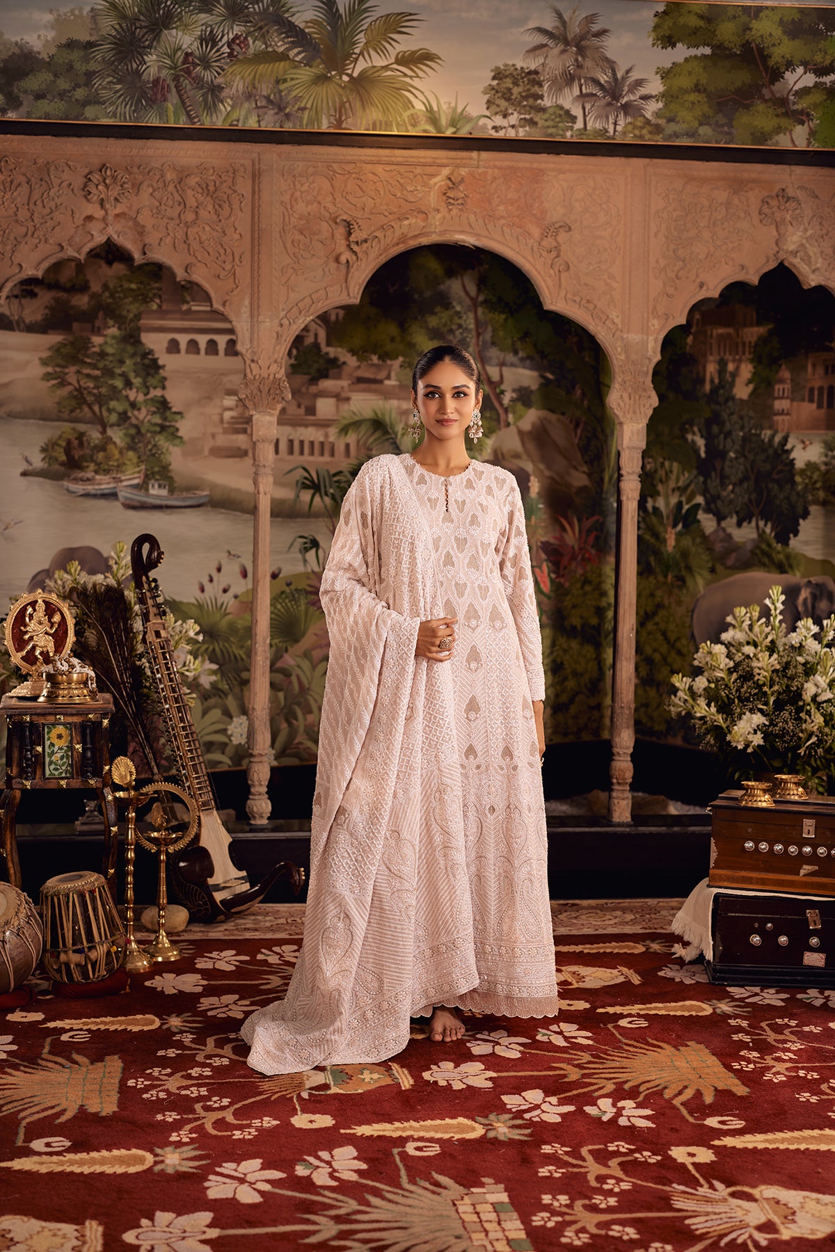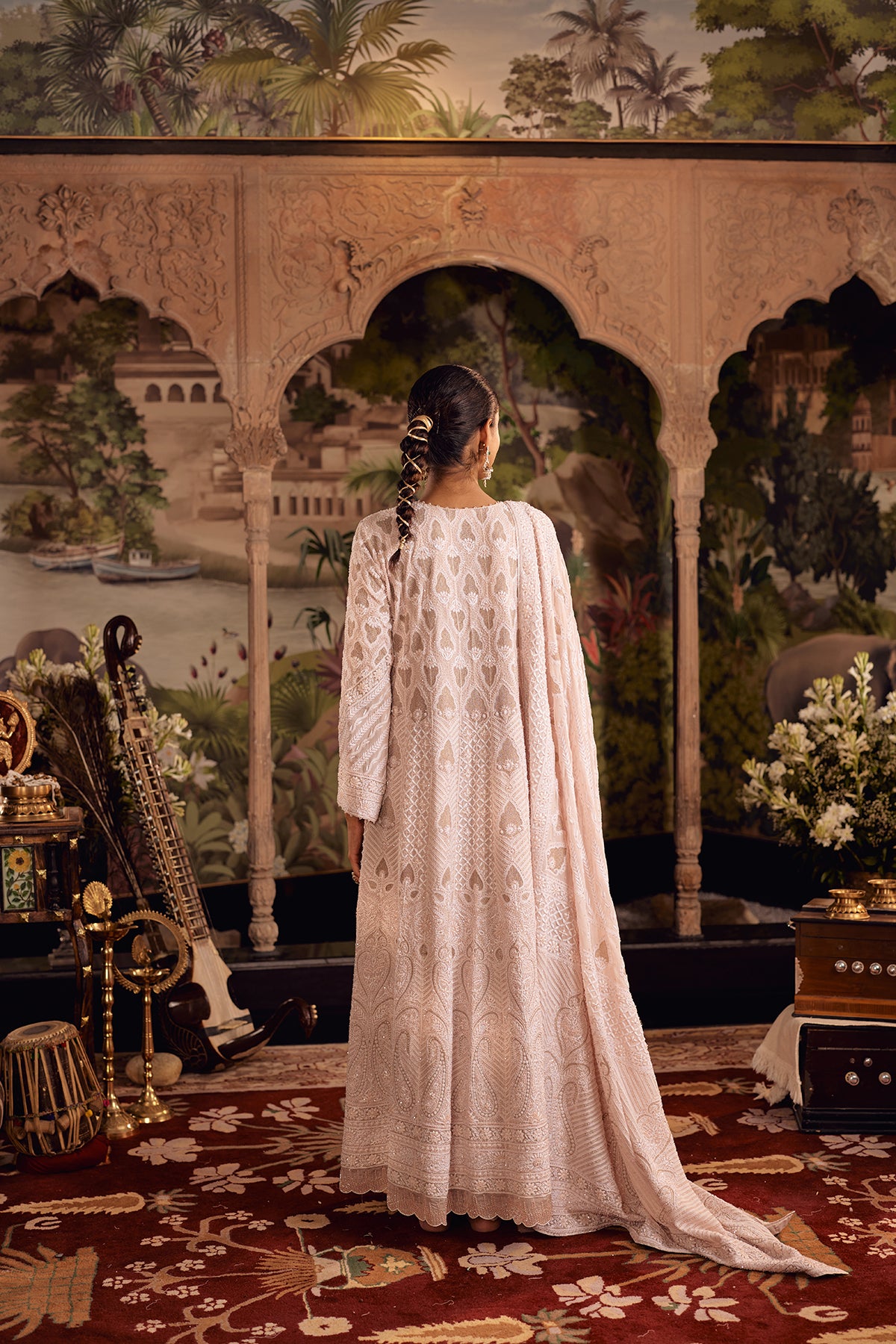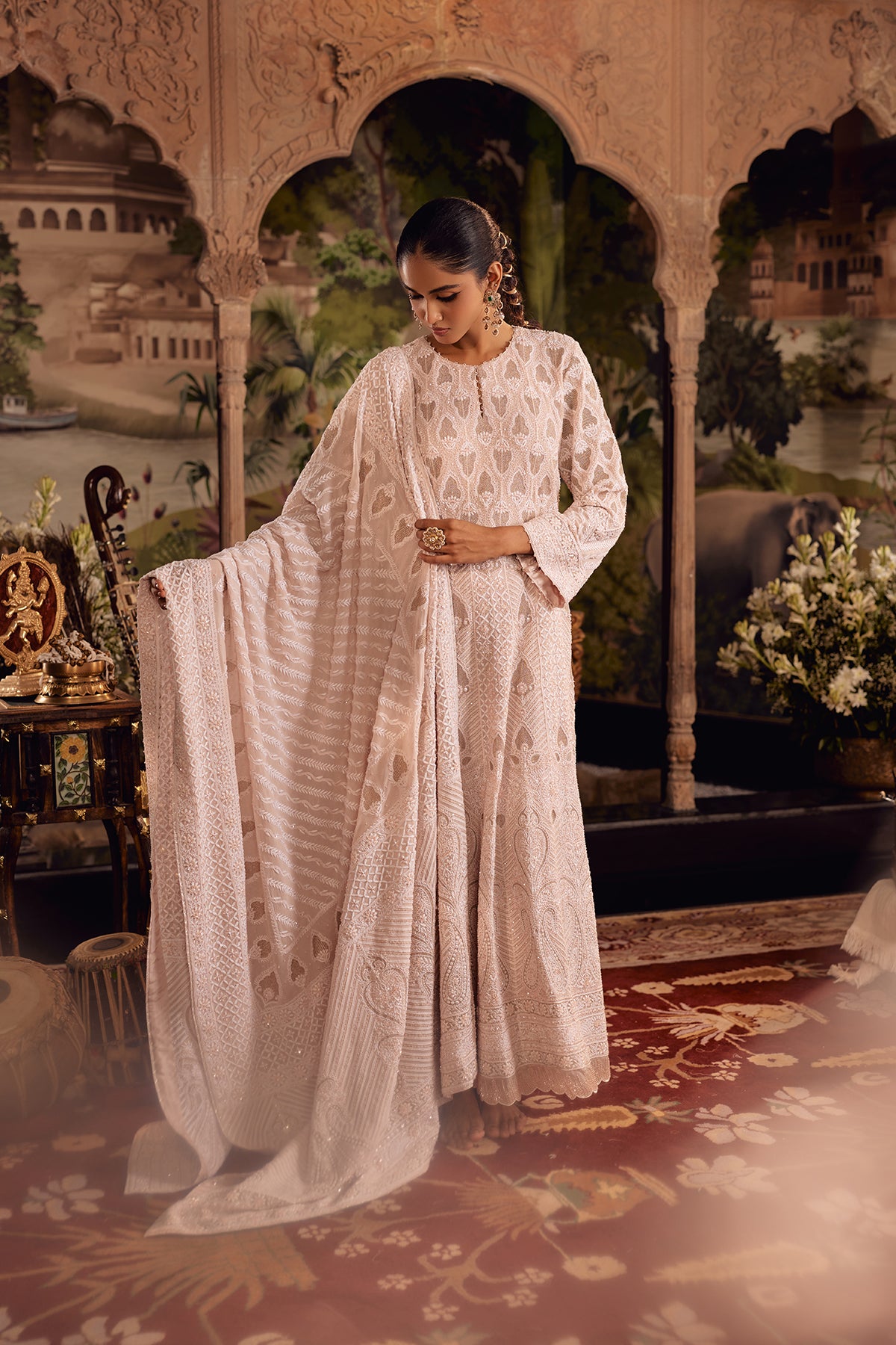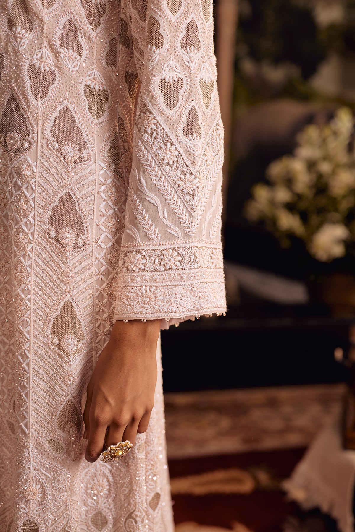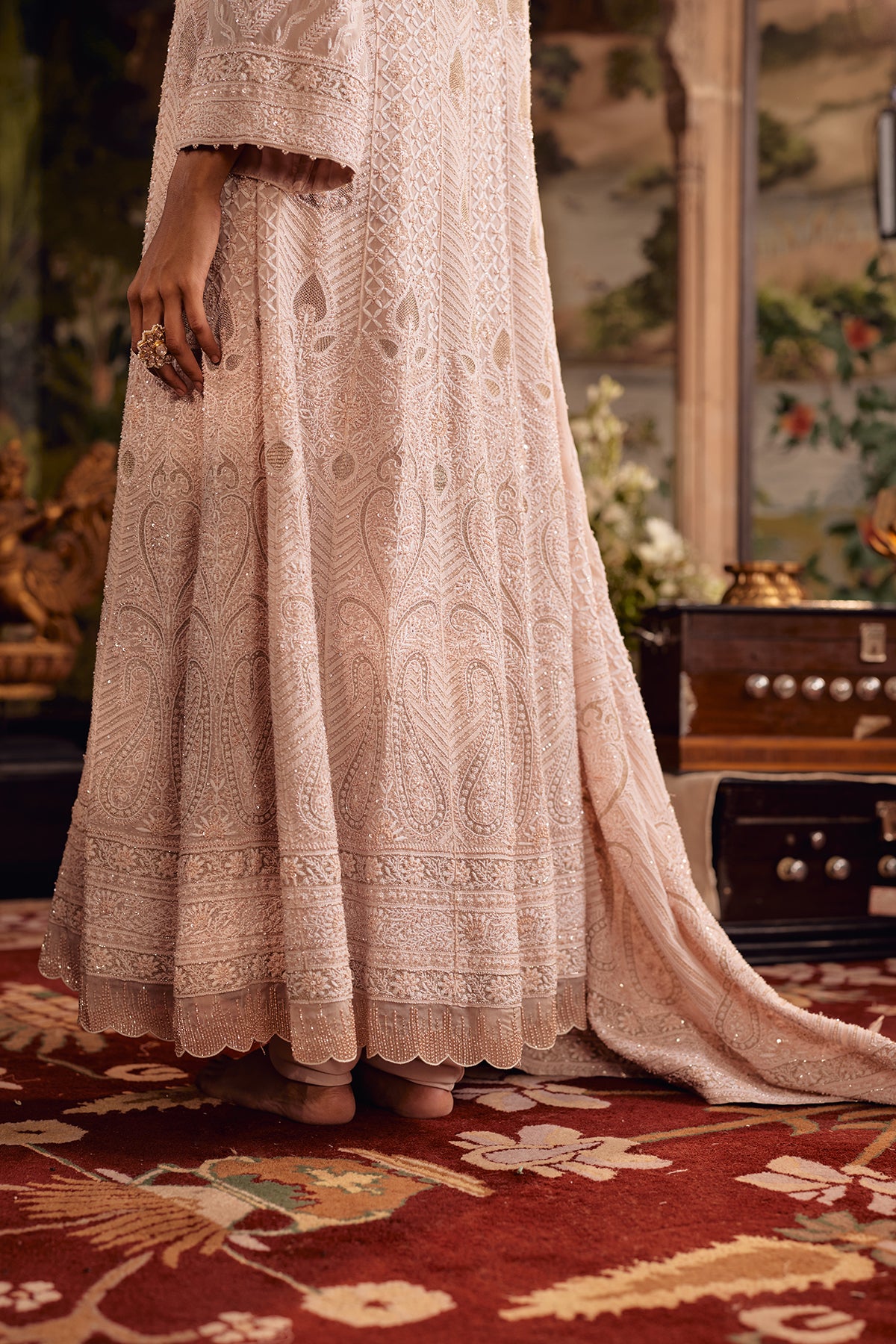Crafted to reveal its detail in layers, this Blush Dust Anarkali plays with contrast and progression. The upper silhouette is richly worked with intricate jaal, gradually easing into a softer palette enriched with fine ghaspatti embroidery. Paisley motifs emerge along the lower panels in delicate shadow work, finished with refined zigzag detailing that adds movement and definition. A scalloped hem, edged with cutdana and pearl accents, brings a subtle glow to every layer.