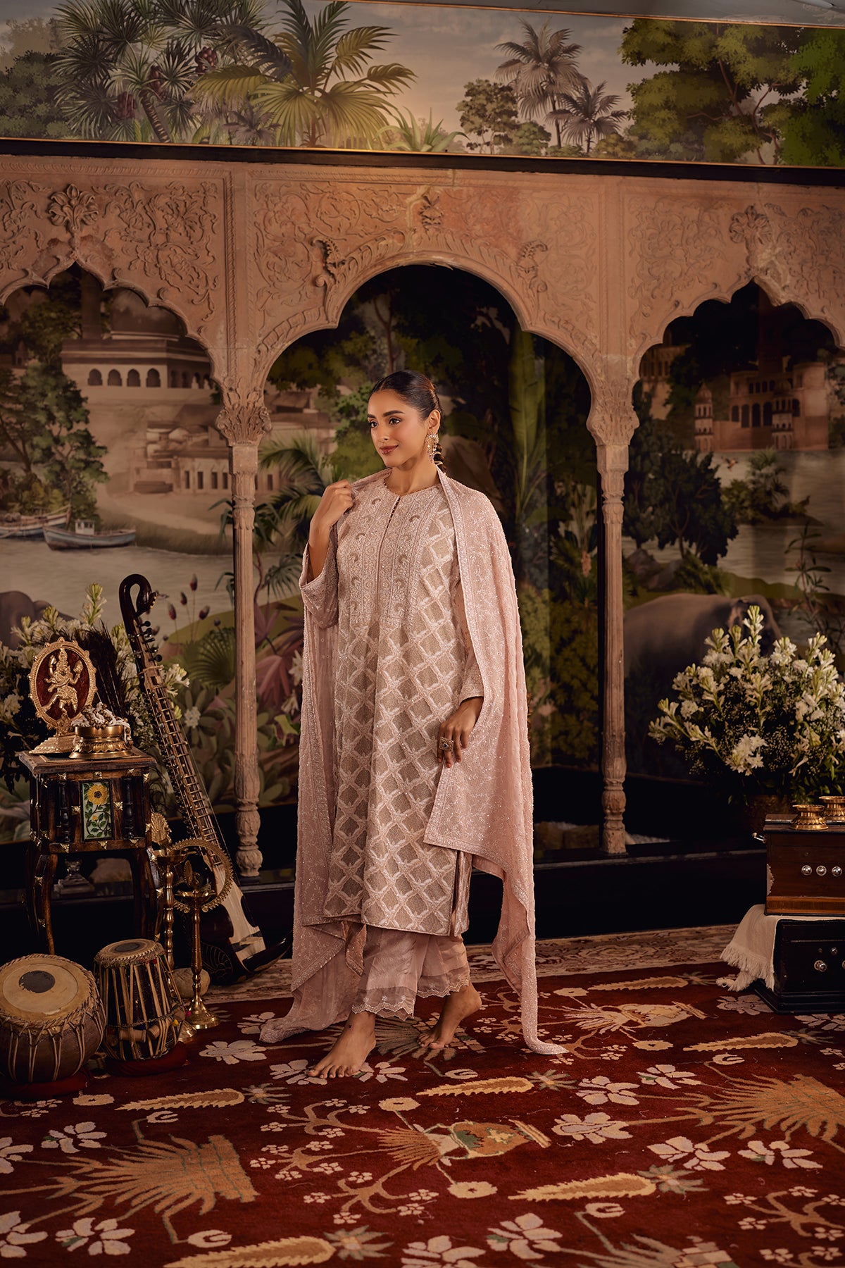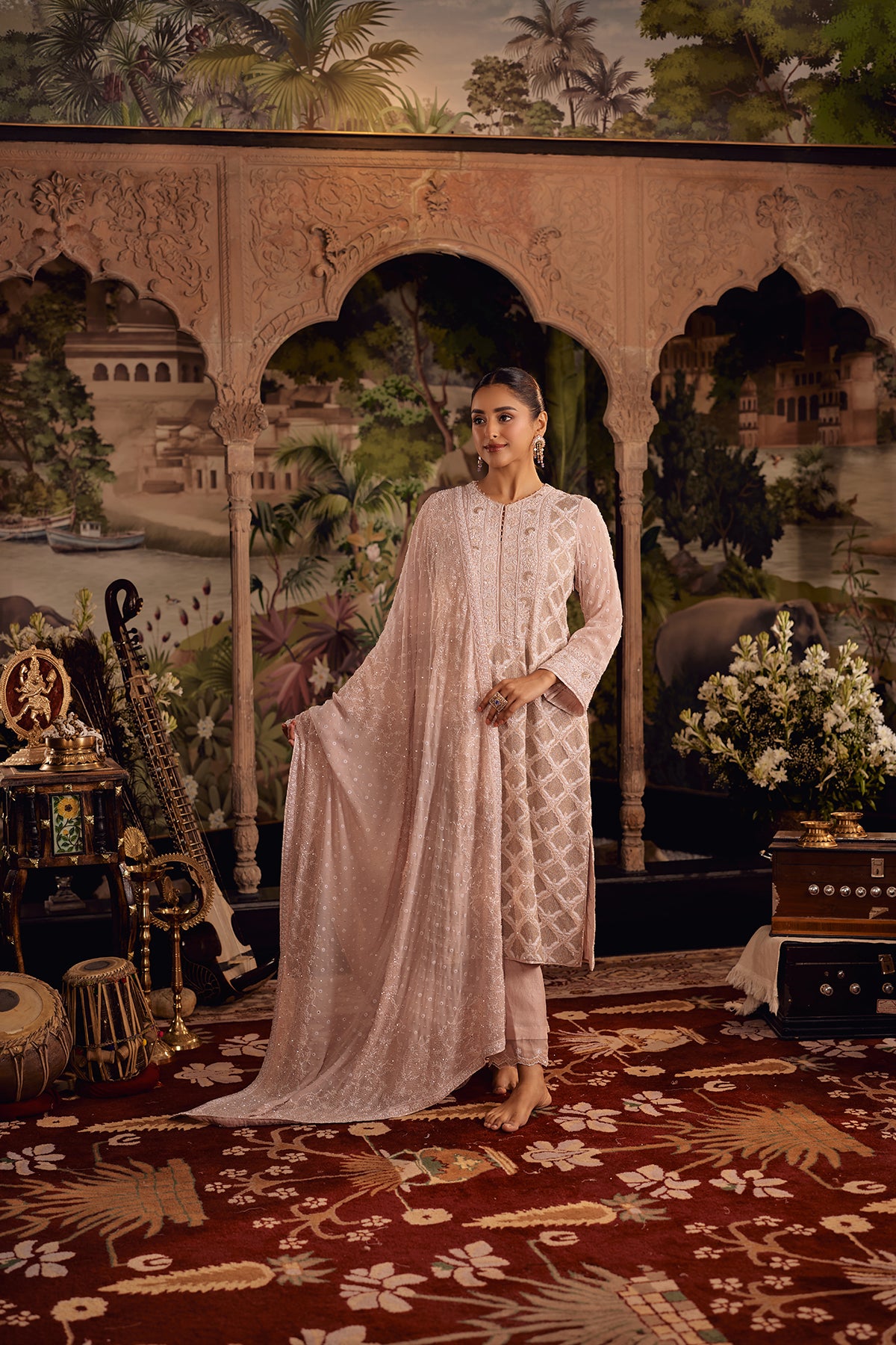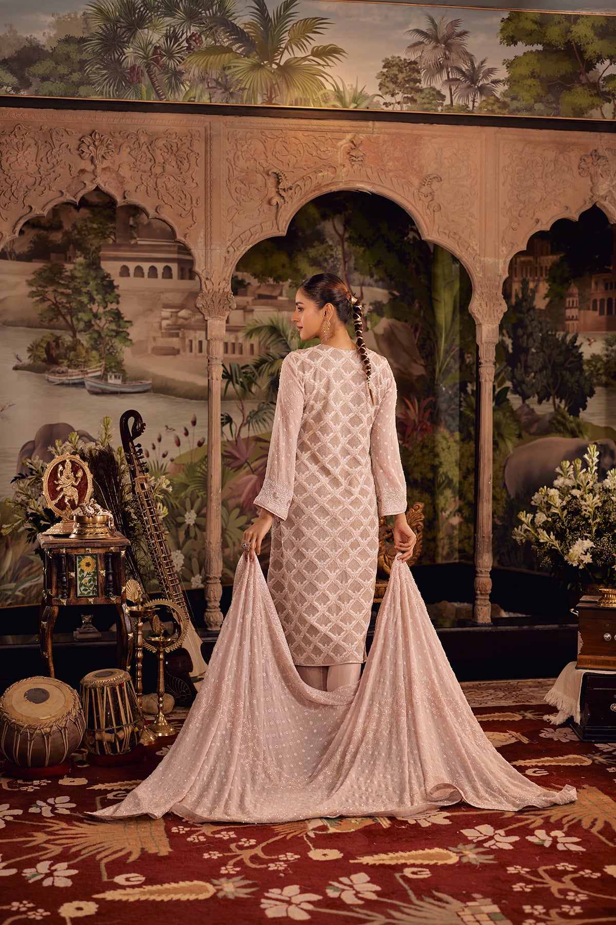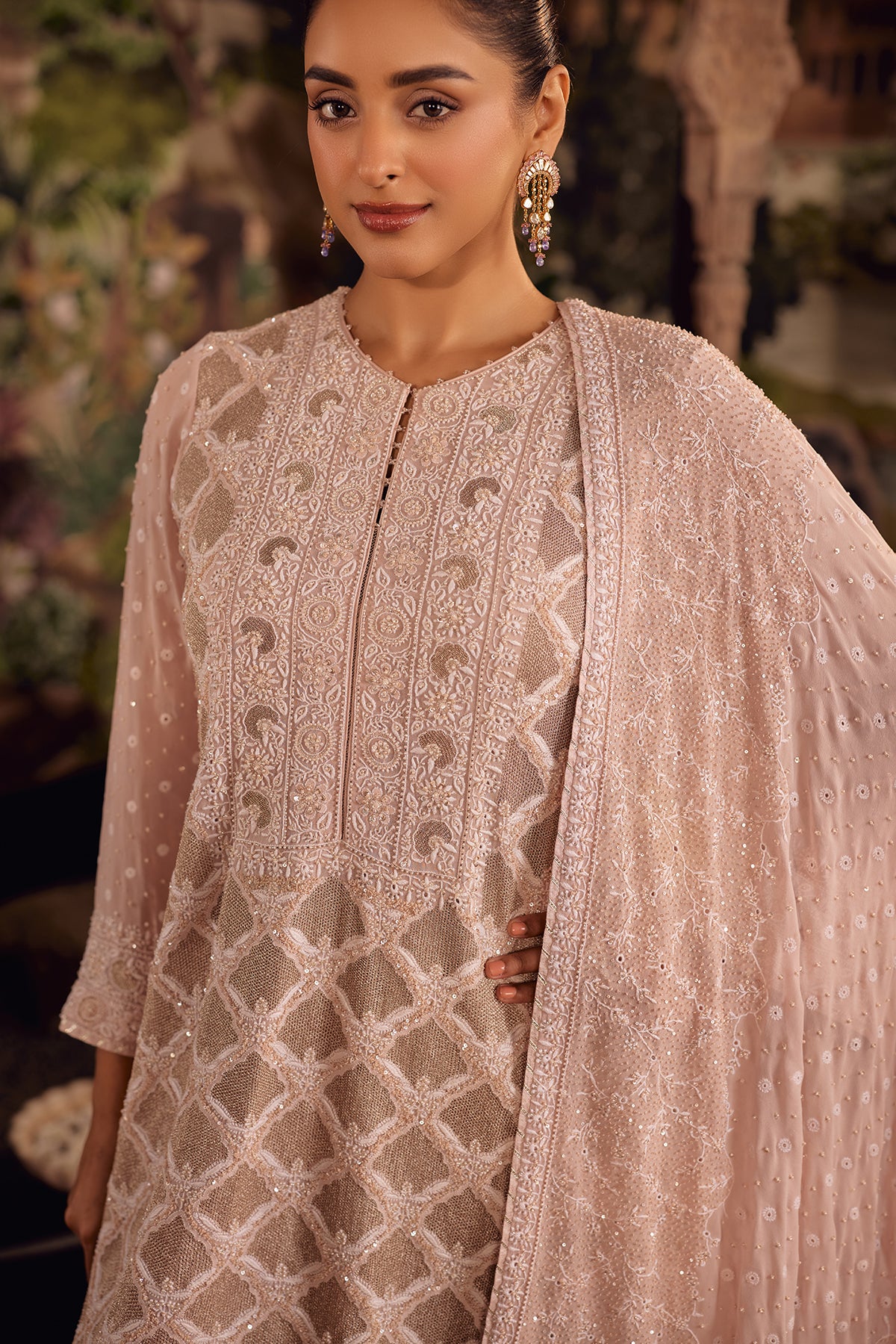A delicate balance of craftsmanship and poise, this Blush Pink Suit set highlights intricate chikankari jaal that flows beautifully across the kurta, accented with fine ghaspatti embroidery and subtle sequins that catch the light. The pants are elevated with an organza patch, softly detailed with sequins to enhance movement and structure.