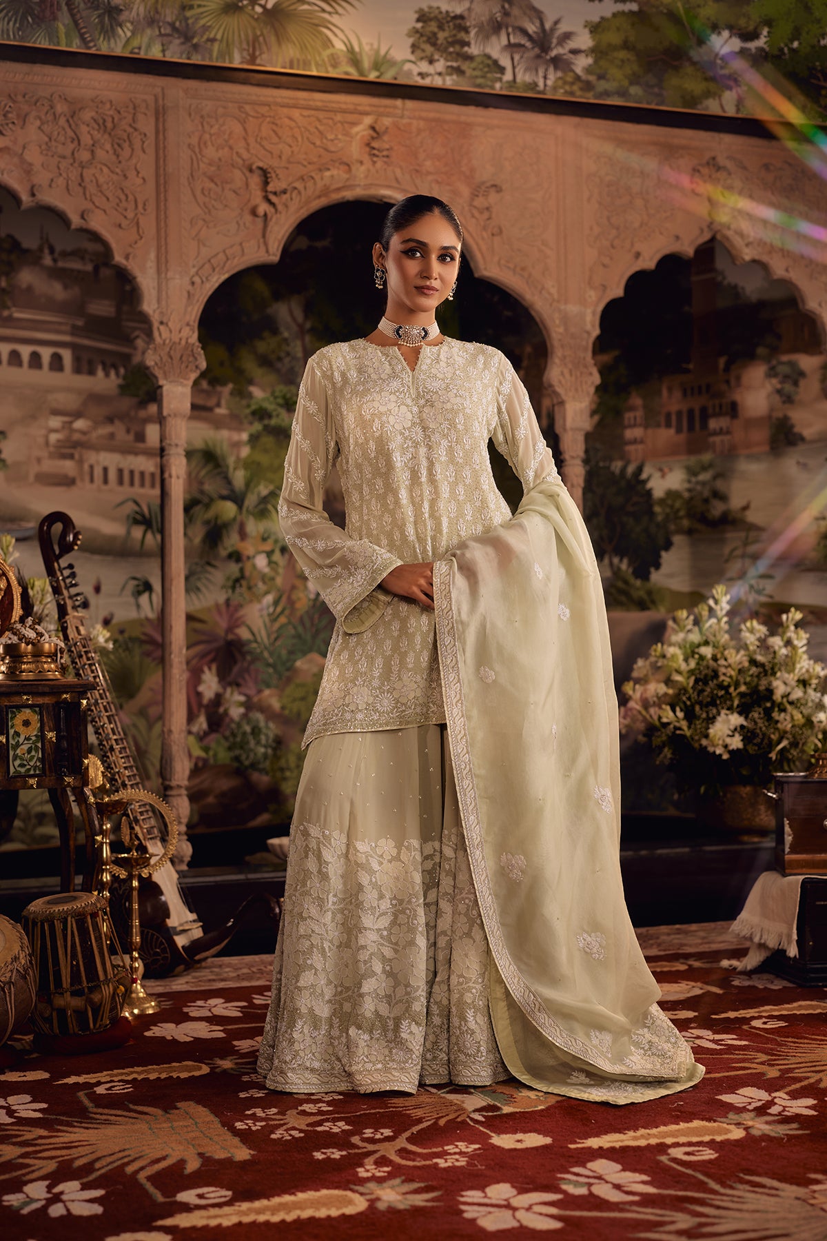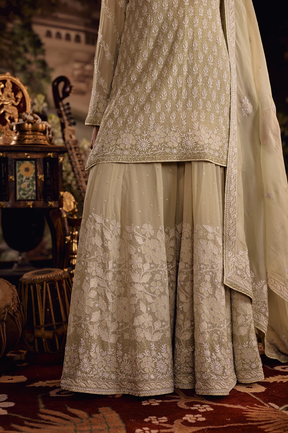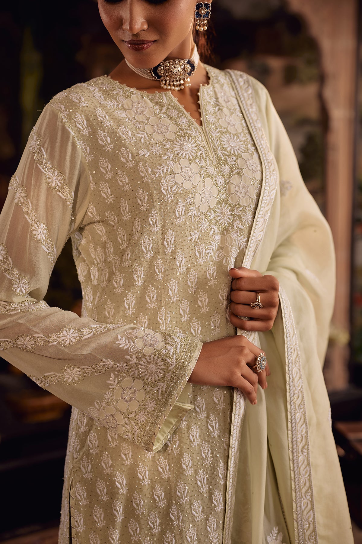 This Pastel Olive Sharara set is defined by richly layered chikankari that rewards a closer look. The kurta is covered in phool-patti motifs worked in ghaspatti, murri, and French knots, lifted with cutdana and sequin accents that add a controlled glow without overpowering the surface. Floral shadow work frames the neckline, sleeves, and borders, while ghaspatti and phool ke bel embroidery runs along the sleeves, finished with pearl detailing that creates a soft, dimensional raindrop effect.