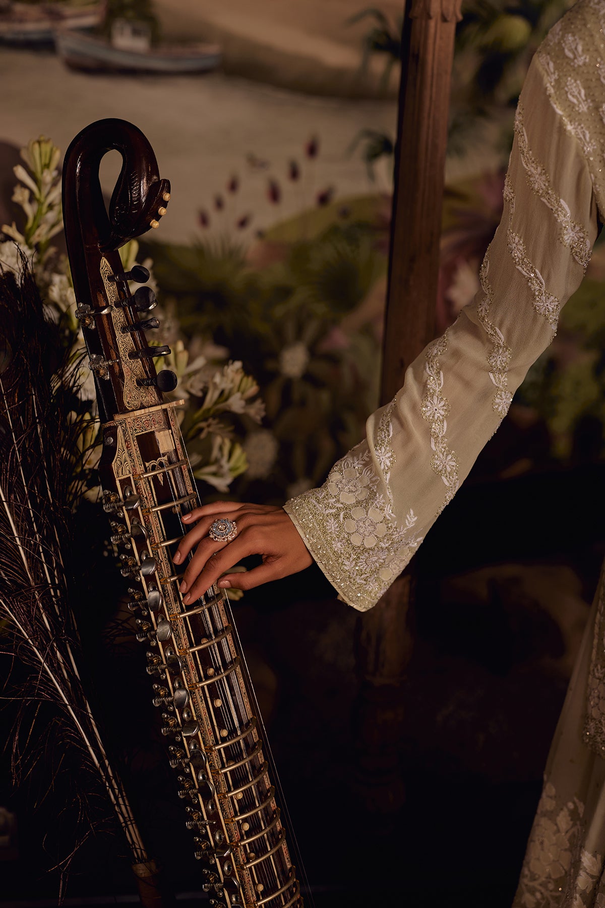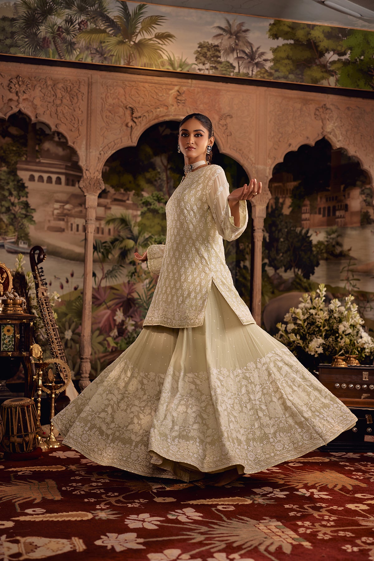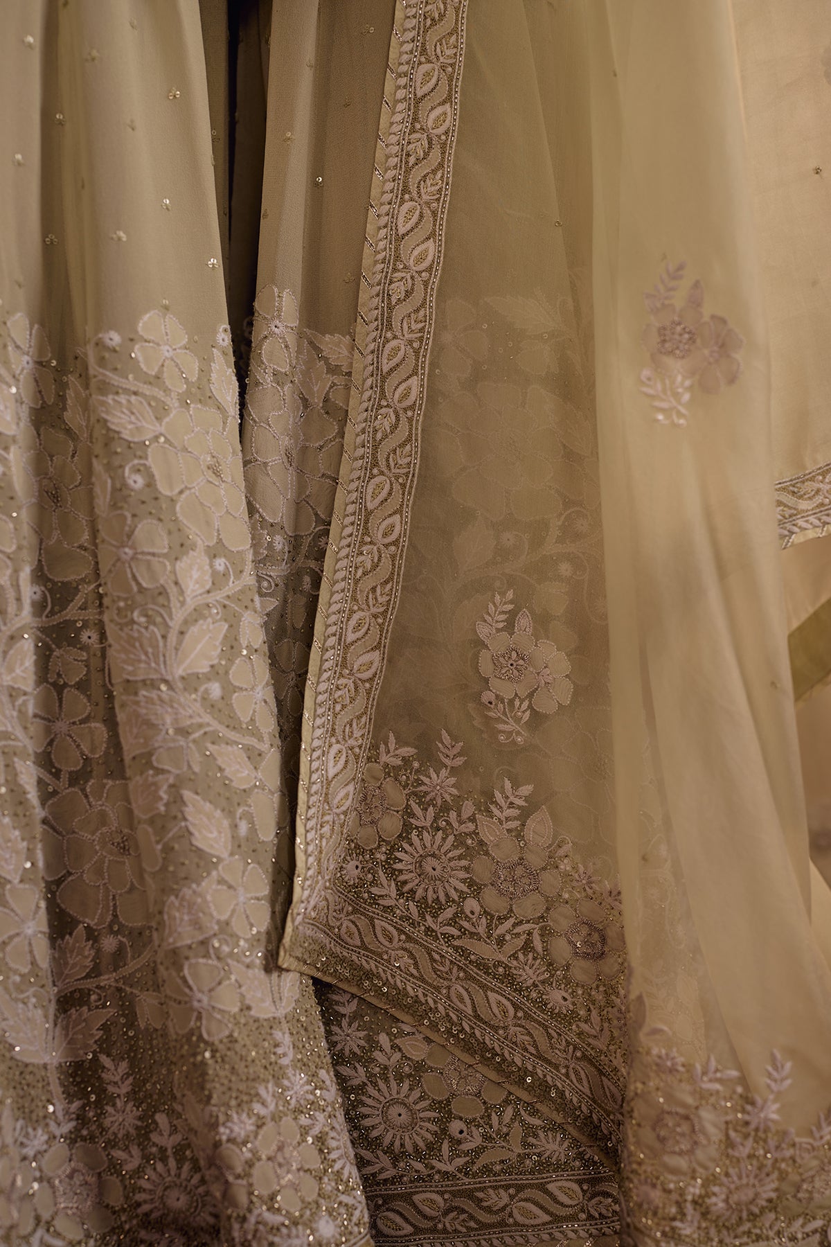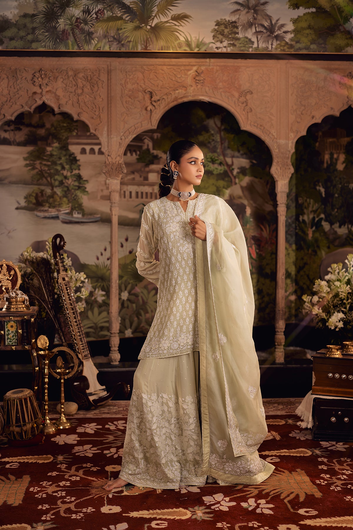 This Pastel Olive Sharara set is defined by richly layered chikankari that rewards a closer look. The kurta is covered in phool-patti motifs worked in ghaspatti, murri, and French knots, lifted with cutdana and sequin accents that add a controlled glow without overpowering the surface. Floral shadow work frames the neckline, sleeves, and borders, while ghaspatti and phool ke bel embroidery runs along the sleeves, finished with pearl detailing that creates a soft, dimensional raindrop effect.