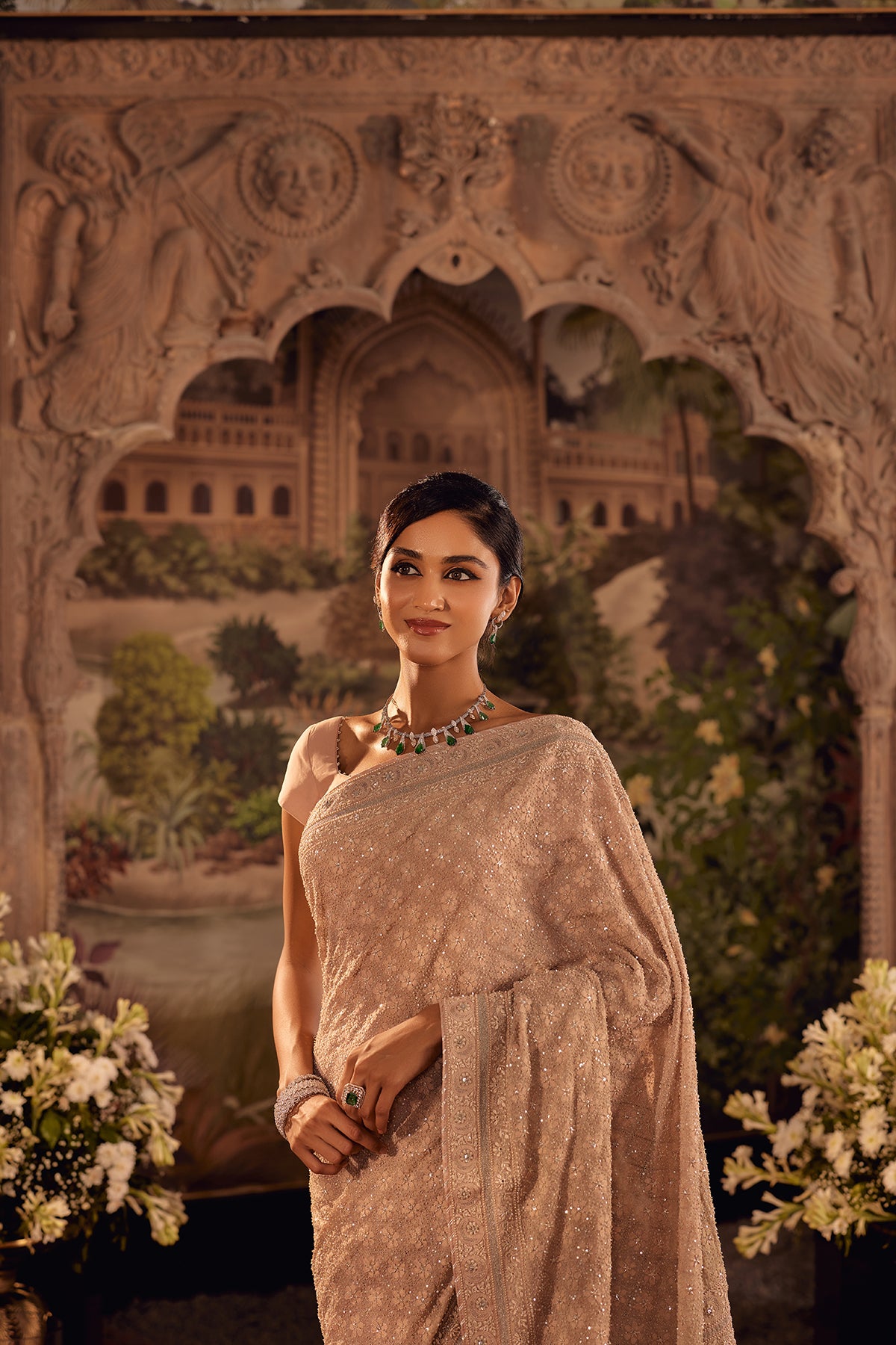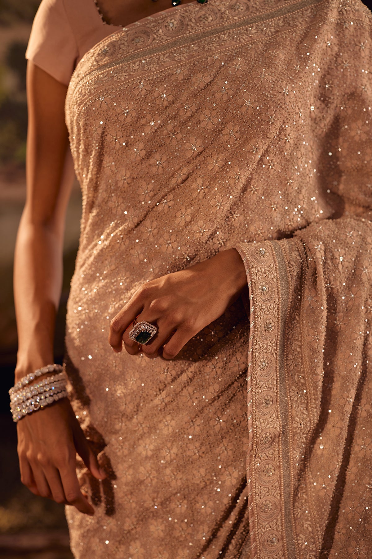 A saree that feels like the concept of light. Crafted in luminous tissue, this Rose Lilac to Peach Ombré drape plays with softness and shine, creating a fluid gradient that feels instantly elevated. The body is scattered with fine shadow-work florals, lightly finished with sequins that glimmer through the weave without overpowering the ombré flow.