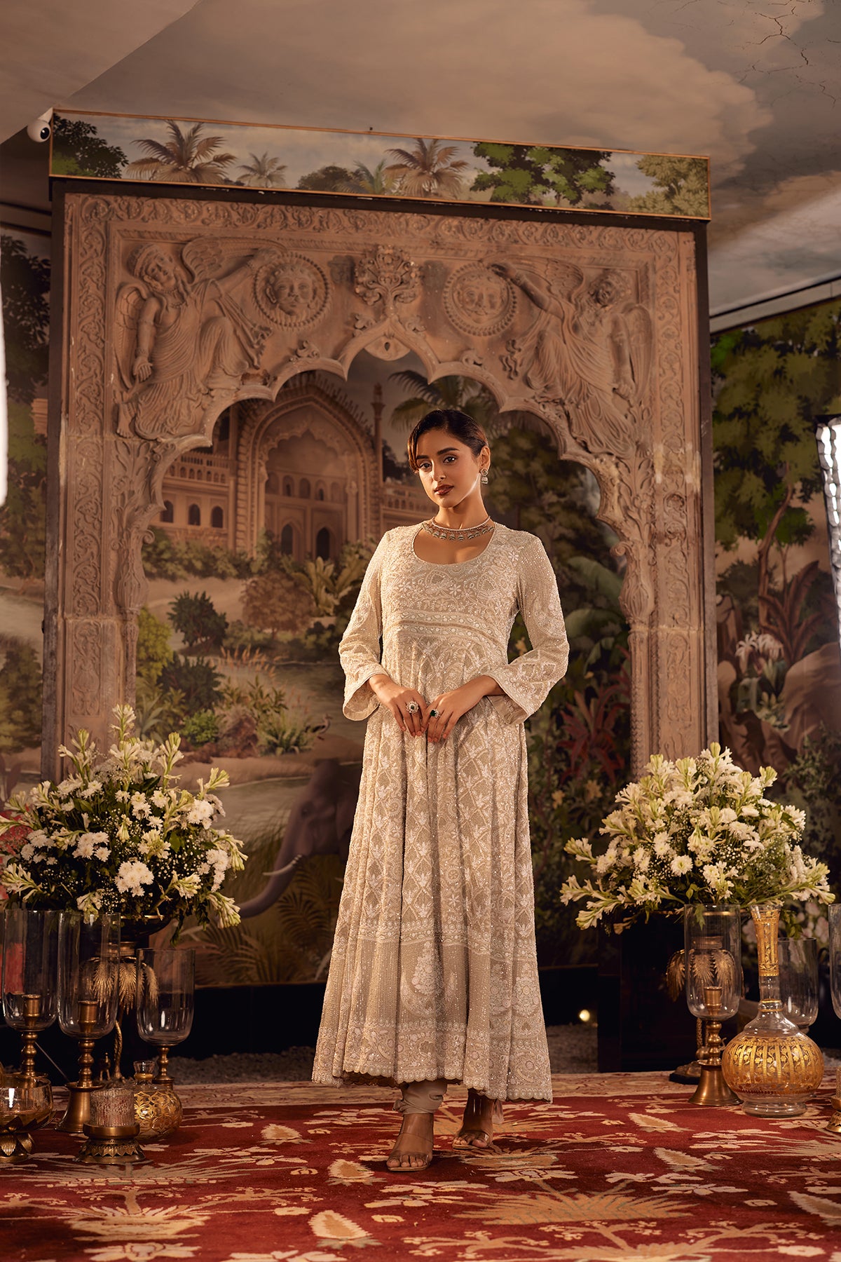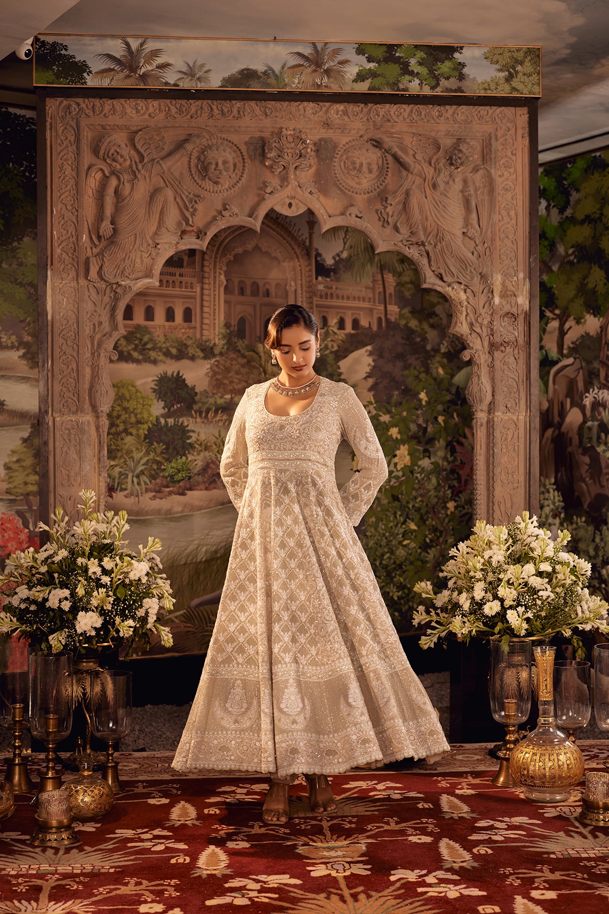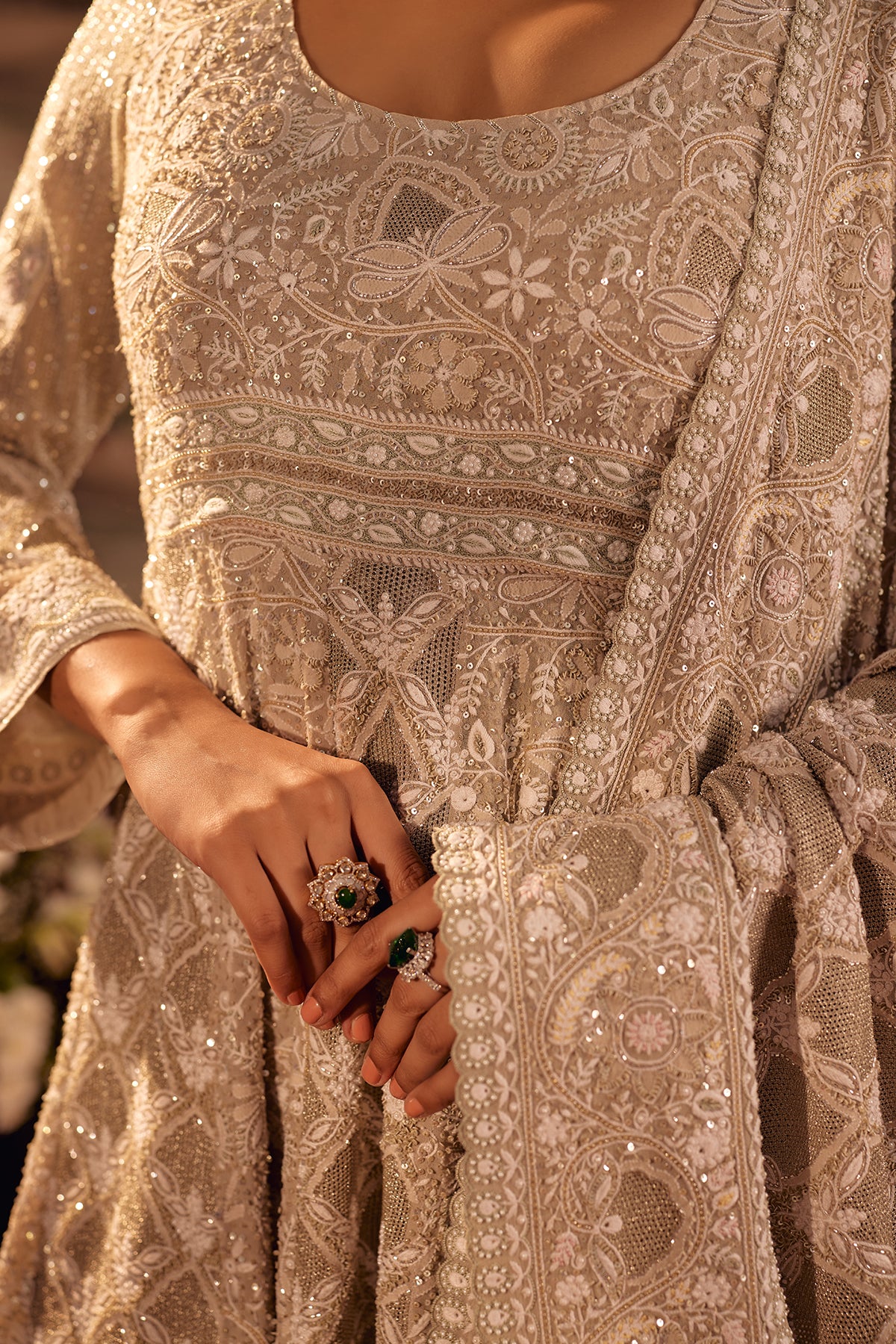 Beautiful and effortlessly captivating, this Sage Mist Anarkali is crafted to celebrate the depth of Lucknowi handwork. The round U-neckline is detailed with floral jaal motifs in shadow work, kasab jaal, and ghaspatti, accented with zigzag embroidery and subtle sequins that catch the light softly. The sleeves feature refined sequin lines and a central moon motif in kasab jaali ke phool, ghaspatti, and keel kangan, while the hem is finished with kasab jaali borders for a structured, graceful flow.